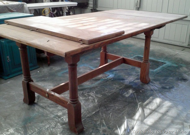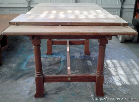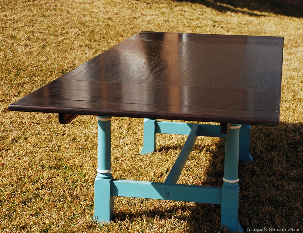 The table is a wonderful Pennsylvania Dutch oak trestle table that I purchased from a very nice lady over the summer (she cried as my husband was packing it into the truck). I had every intention of refinishing soon, but it was the perfect height and size to use as a work table.. YIKES! So there it sat until a super nice lady came by to see the 5 Legged Table that I had just refinished.. she LOVED it but it just wouldn’t work for her in her newly remodeled space. So, as luck would have it I had three (yes 3.. don’t you have 3 dining tables hanging out in your garage too..!) unfinished dining tables for her to look at… and no I’m not a dining table hoarder, but I TOTALLY could be if given the chance! Lucky me she fell in love with this table and wanted it to be finished like the round one.. no problems there! Let me tell you though this oak top was a seriously hard.. some stripping, lots of sanding and few coats of Dark Walnut stain. I distressed the stained top to have a more casual feel to it.. see the client has kids and starting it off with a slightly worn look may help the natural wearing that it will get! I also chose to finish the top off with a couple of coats of wax instead of polyerethane. My reasons for this were simple.. if something should ever happen to the top (you know kids and sometimes husbands