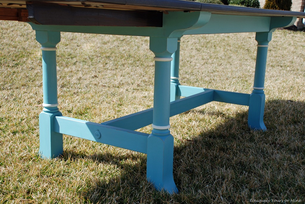 ) she could easily fix the scratch with some stain then apply another wax coat and it would look as good as new! The base is painted in ASCP Provence with the stripe in ASCP in Old White. The base got a very light distressing, a coat of wax and then a nice buff.