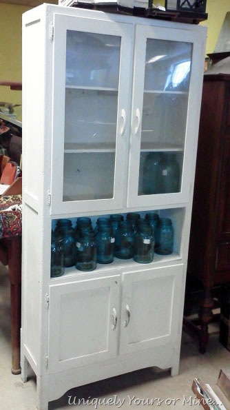 The cupboard glass had been replaced with Plexiglas at some point and whoever painted this should NEVER be allowed to paint again… I cannot tell you how many drips and drops there were! The best part.. wait for it… the very best part… they painted OVER the shelf paper that lined all of the shelves! Really.. too lazy to remove shelf paper? I bet they didn’t even clean the paper before they painted it! Also, it looks like the middle section used to have a drawer but was removed at some point…I kind of like it now better! So there were some issues… but I do love the vintage look of the piece..