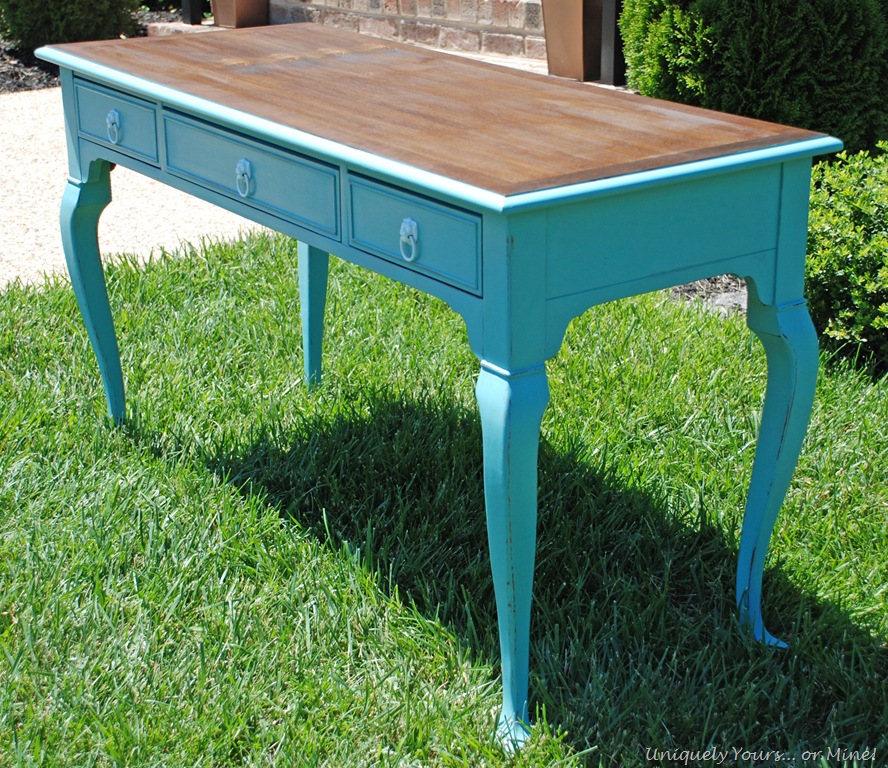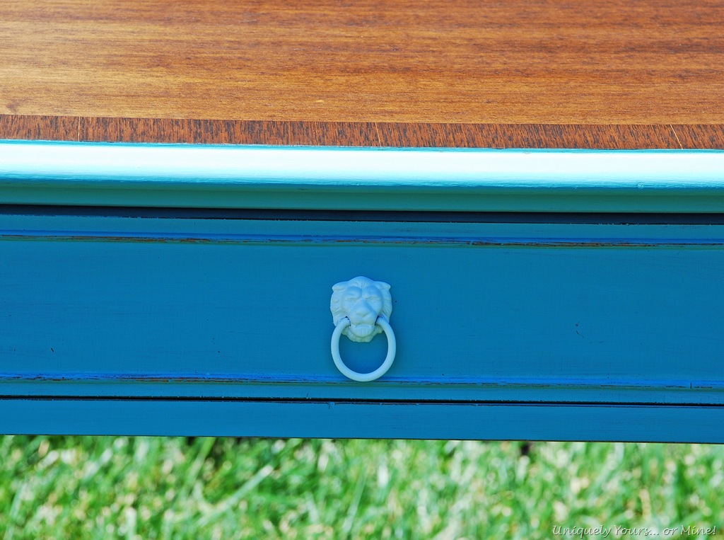 I painted the base in Annie Sloan Chalk Paint “Provence”, lightly distressed it and applied a coat of wax. I also sanded off the original finish ofrom the top and refinished it with dark walnut stain and a couple of coats of wax.