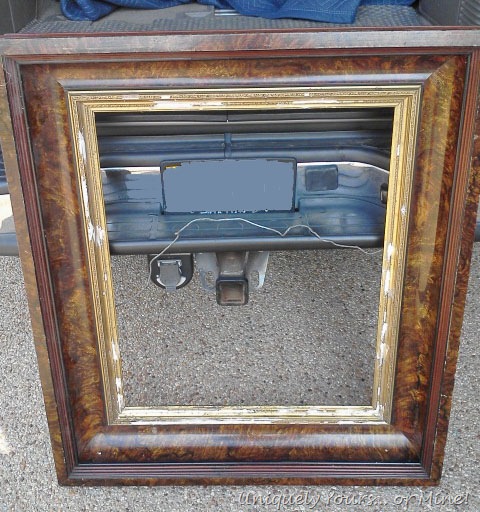 I picked up this mid-sized vintage frame a few weeks ago… man was I getting my “junkersize” on with this one… it’s much heavier than it looks as it is gesso on wood and THICK! Gorgeous looking burled wood frame with gilded details… someone had attempted to repair the gilded gesso pieces that were missing… not sure what they were thinking!