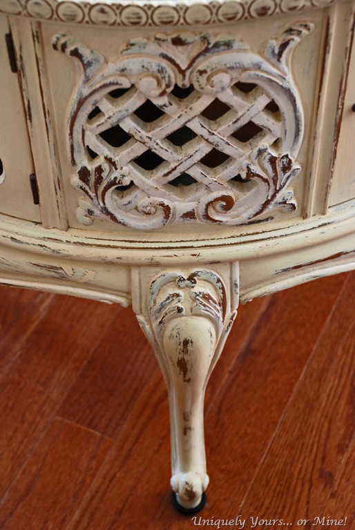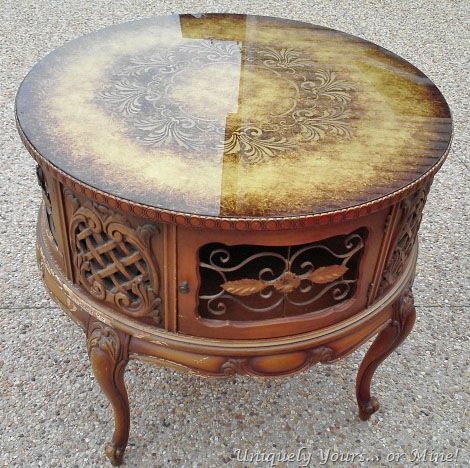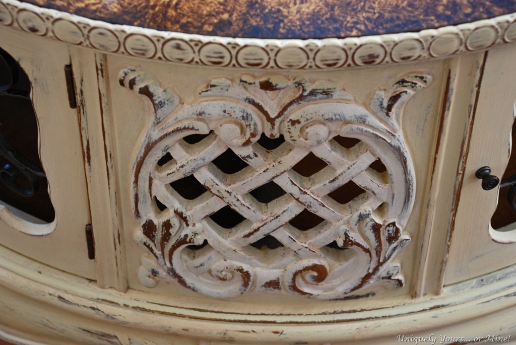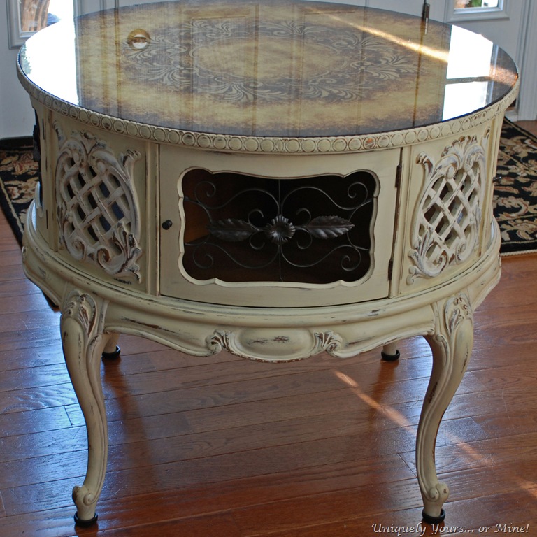 I just LOVE this round French table! Not only is it pretty to look at but it has storage too… what?! The glass top has this wonderful treatment to the underside… however it is missing a knob and the trim around the top has some damage, but it is in great structural condition so I would say an overall fabulous piece!