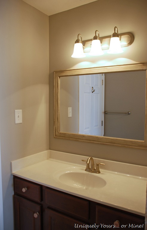 We also painted the bathroom, removed the builder’s grade mirror and replaced it with one I found at Hobby Lobby… I think it will just be temporary though as I found a vintage one for the other vanity and I just love the look… so I‘m on the hunt for another vintage mirror for here…