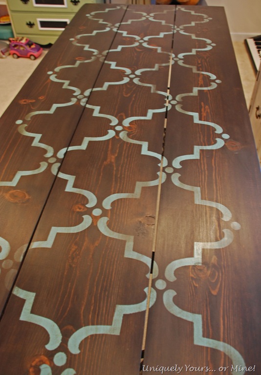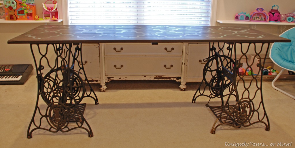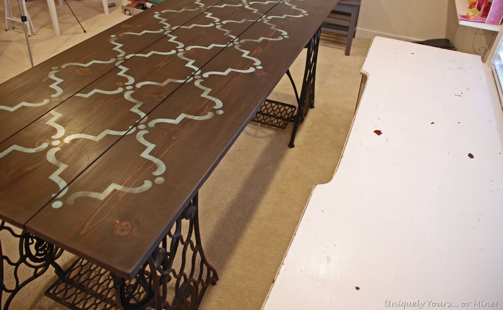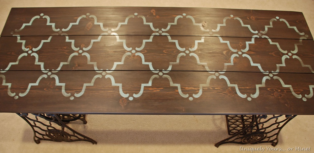 I knew I wanted to do something else with the top and this is what I came up with… The stencil shape just happens to mimic the shapes in the sewing table bases…