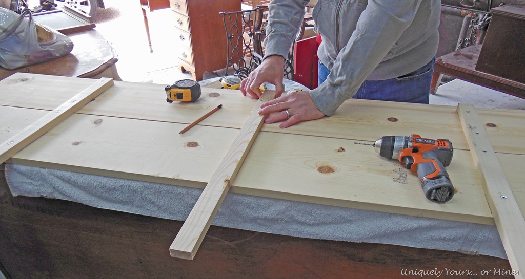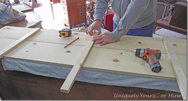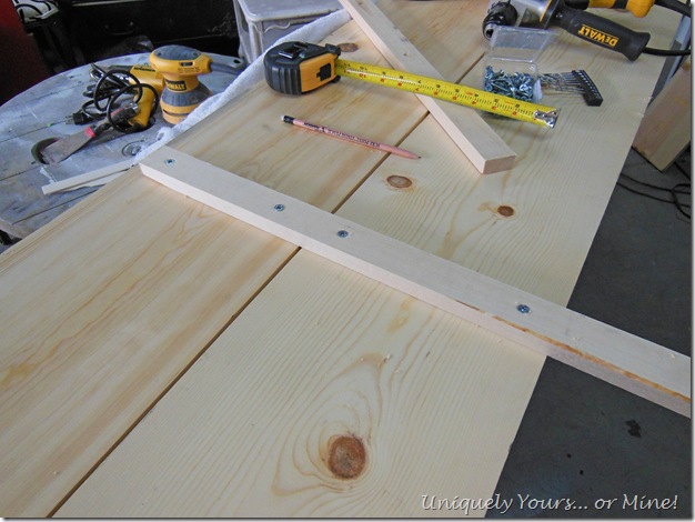 We attached the planks together with 3 pieces of 1×2’s using 2 wood screws in each plank. We drilled pilot holes prior to screwing… very important or else the wood can split!