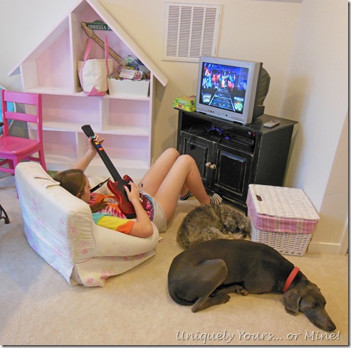 This is the perfect place for the kids to sit and play now! They can play board games or setup their LPS houses or whatever! My oldest daughter doesn’t understand why we went through the “trouble” of making this table look nice as she is certain the kids will “mess it up” but I have some faith… Thinking smile