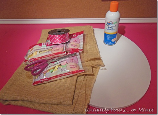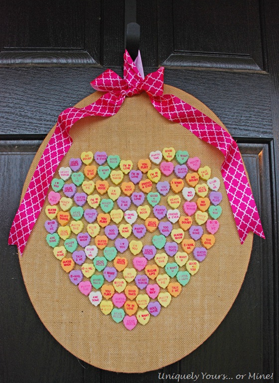 I decided to make a “wreath” for our front door in celebration of Valentine’s Day. I’m using an oval canvas, burlap and three bags of those large conversation hearts…