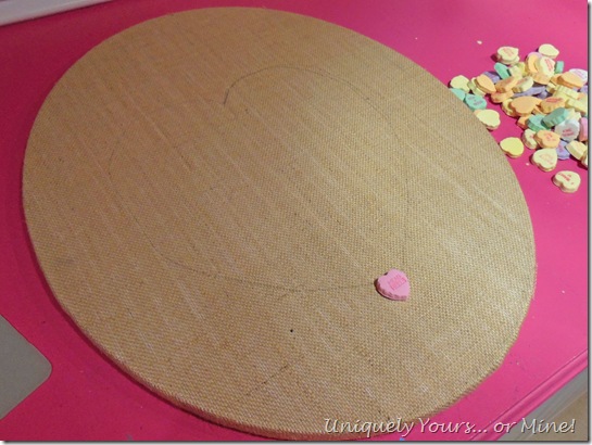 I drew a very rough sketch of the heart with a pencil onto the burlap fabric and I started to layout the candy along the line beginning with the bottom.