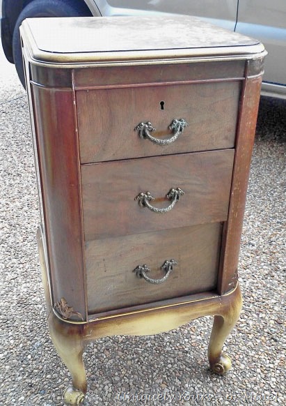 I found this nightstand and loved the shape, but especially the pulls! It obviously needed painting and the bottom drawer needed its stop reinstalled but other than that it was in good shape… but strangely heavy for its size!