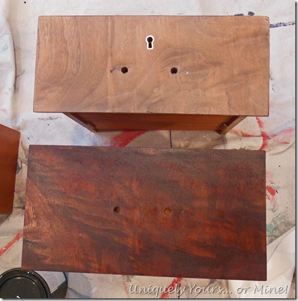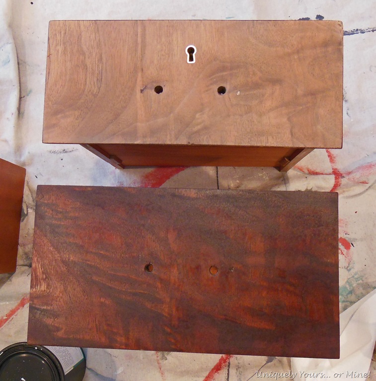 The top drawer has been sanded, the bottom drawer front stained in Dark Walnut Watco Oil.