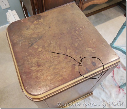 Now onto the top… this is what it looked like before… not good right? Look closely at those two stains I’ve circled, they will come back to haunt me!