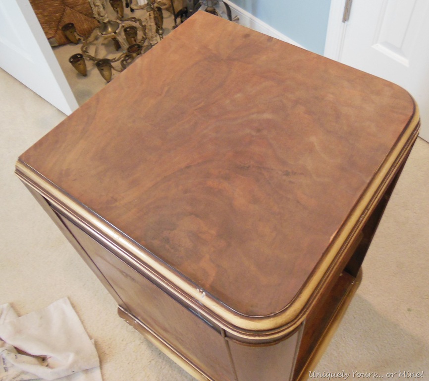 I hadn’t quite decided what I wanted to do with it yet, but I wanted to see if the top and drawer fronts were viable for stain… so I removed the old finish with 220 grit sandpaper, most of the original finish was already gone so this was a quick and easy process…