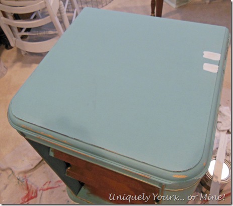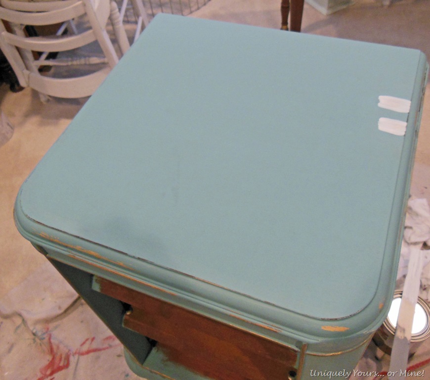 So I had to move to option 2, paint the top, of course I should have primed it because even after 2 coats those stains kept showing through.. ARGH! So I had to sand down those little areas and apply a couple of coats of Kilz and then repaint to even up the finish… VERY frustrating!