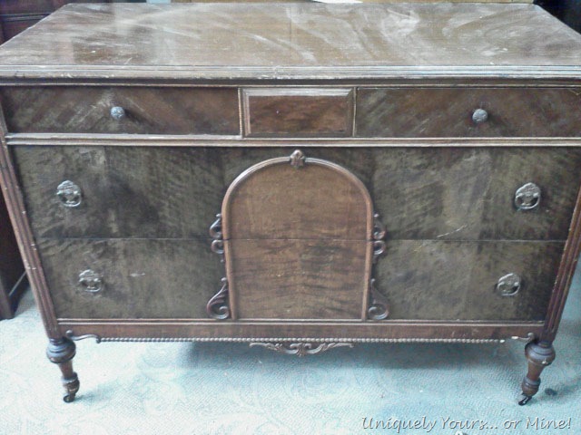 Other than significant veneer loss on the sides and a few onlay wood pieces broken, it was in good condition, but better than that it was going to be just beautiful and was going to make a perfect changing table / dresser!