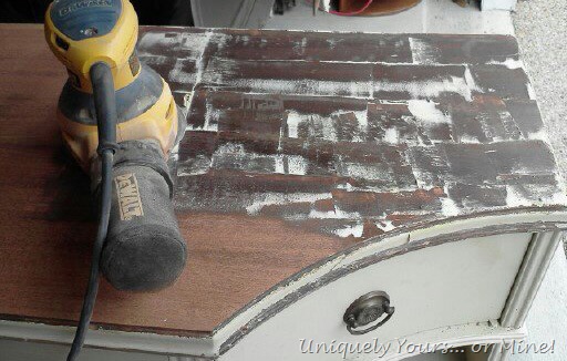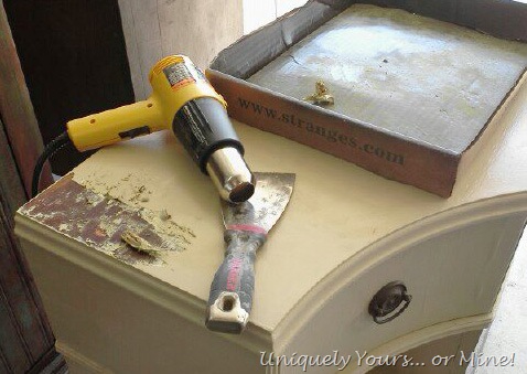 I was removing the paint off the top in hopes that the wood underneath was in good shape! I “love” my heat gun and prefer to remove paint with it instead of chemicals, but it was a slow process… heat up paint, scrape it off, deposit paint scrap into cardboard box… REPEAT a hundred times… but I was determined!