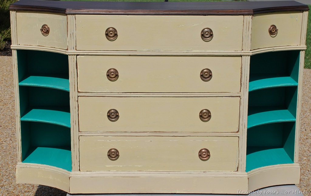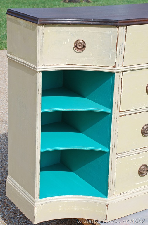 Rather than repaint the buffet I decided to distress the paint that was there. I really liked the color, sort of an Old Ochre with a touch of green, and it distressed wonderfully. I did decide to paint the side display shelves and for that I chose Annie Sloan Chalk Paint in Florence. I thought it would add a great pop of color to the piece!