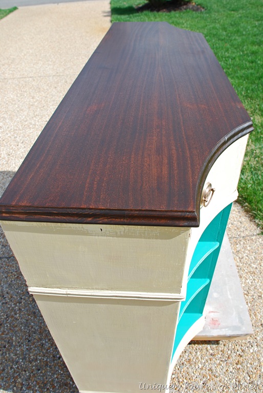 I also waxed the cabinet part of the buffet to bring back the shine that the sanding removed, the final finish is smooth feeling but distressed looking!