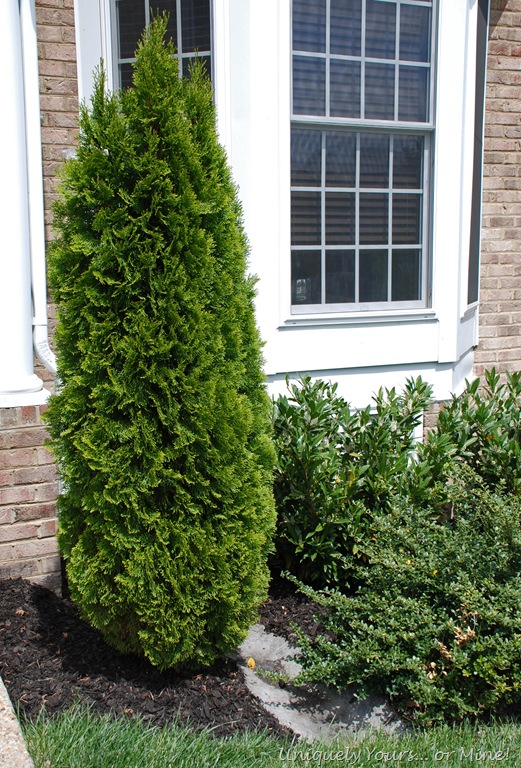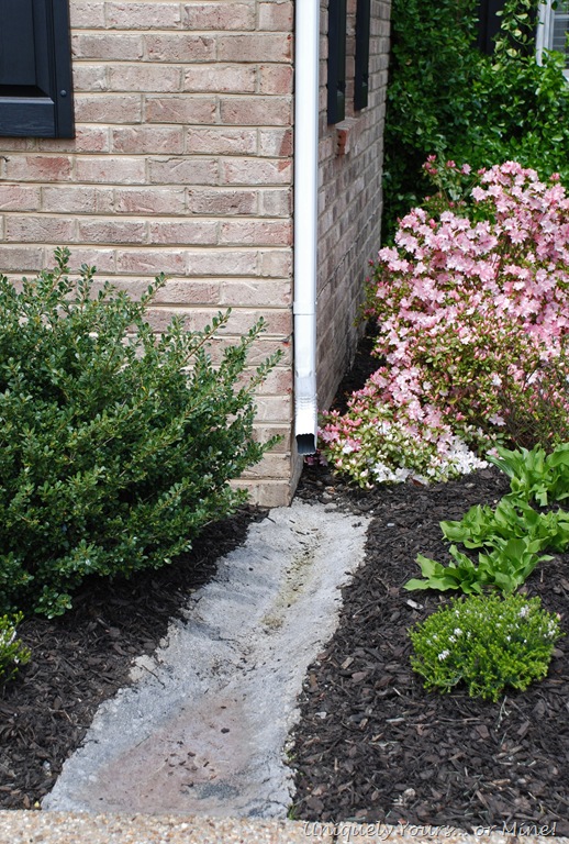 Here’s the scoop… four years ago I spent HOURS UPON HOURS looking for an “acceptable” solution to diverting rainwater from the house. When our house was built they installed those black plastic ribbed hoses on the downspout’s in order to divert the water away from the foundation. These 4” black hoses snaked through our front boarders, sunning themselves on top of the mulch! So some of you may be thinking “so what?” and I hear you, but for me I hated looking at those things… they drove me CRAZY (which may have been a short trip)! Like I said, I looked for several month’s for a solution, I thought that there was no way I was the only one that was bothered by this… well apparently I was (which I did’t understand)… I guess I’ll just have to make something work!