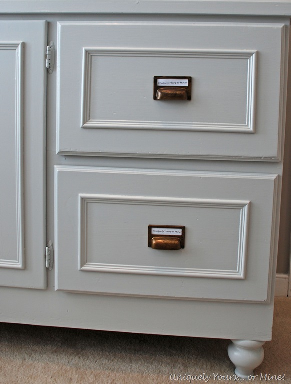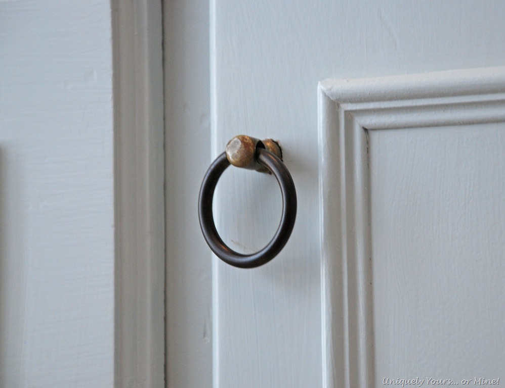 I added some “new” hardware, well actually the bin pulls are new, but the ring pull is from my grab bag of vintage knobs that I’ve had to remove from other pieces, the finish match is PERFECT! The paint is Cabinet Coat tinted in Stonington Gray, it’s about the lightest gray I have ever worked with and I adore it!