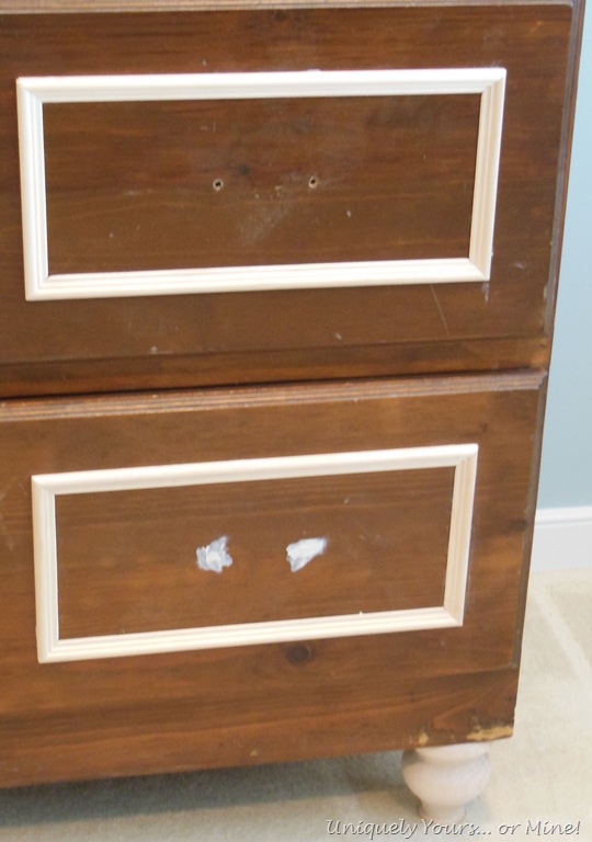 Oh, yes the small trim added just the right amount of detail to the fronts of those super plain drawers. I also filled in the old screw holes with wood putty in preparation for the new hardware.