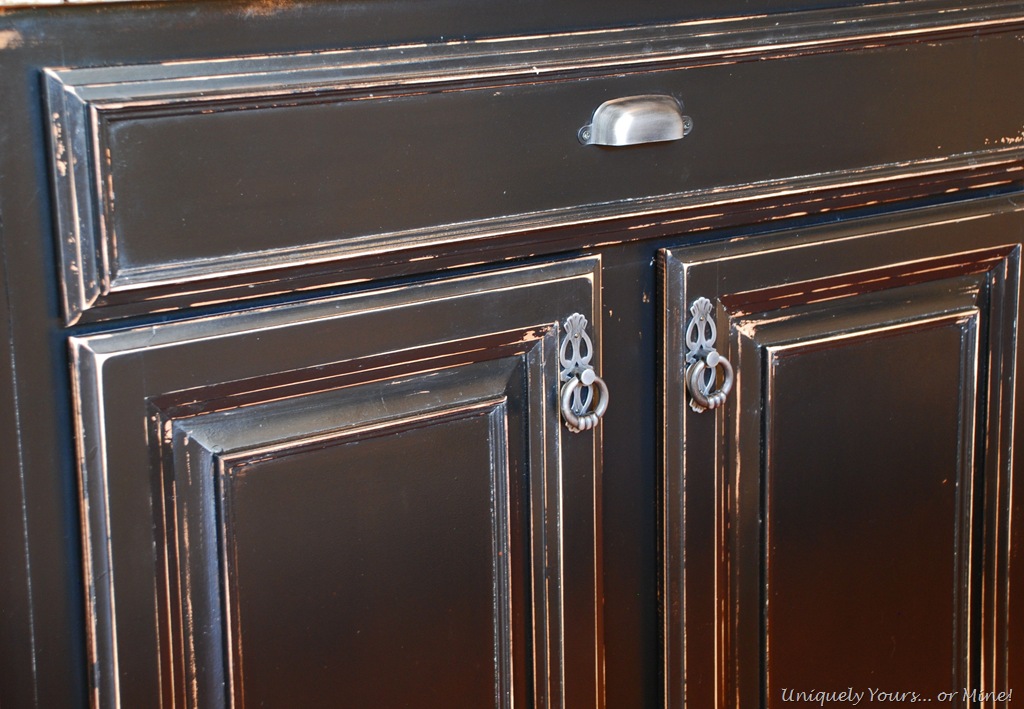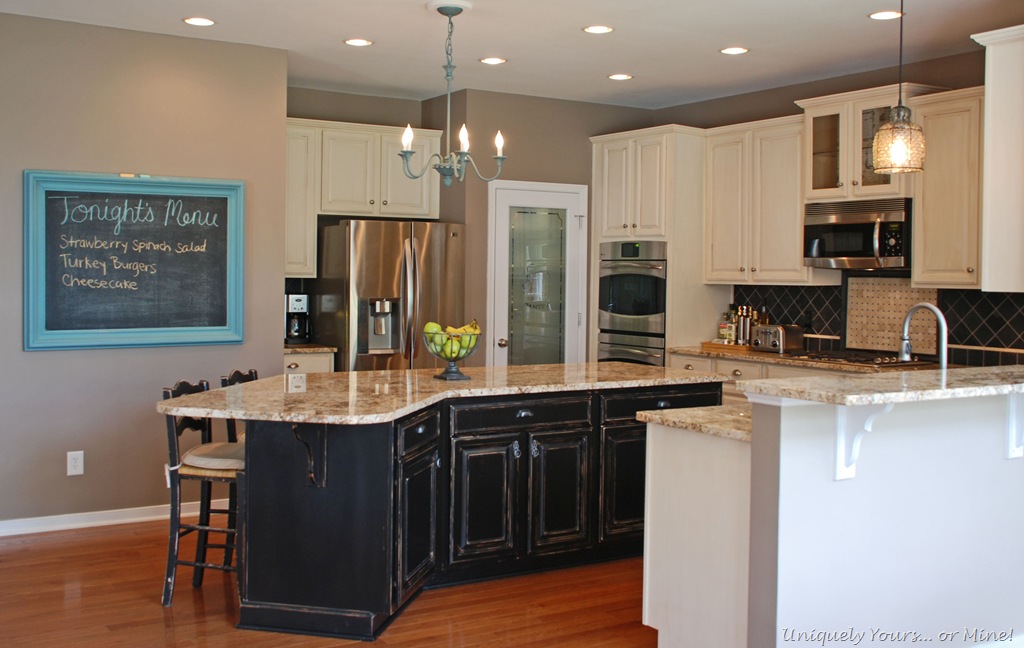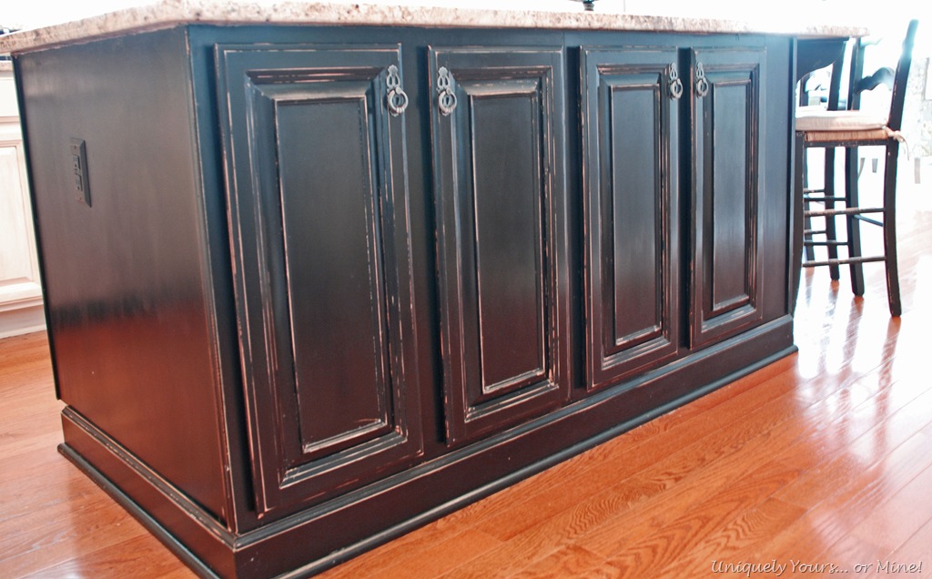• The black center island is painted with Valspar Black satin, distressed, waxed and buffed. I didn’t prime this either, just wiped it down with TSP before painting. I applied 2 coats with a foam roller and foam brush.