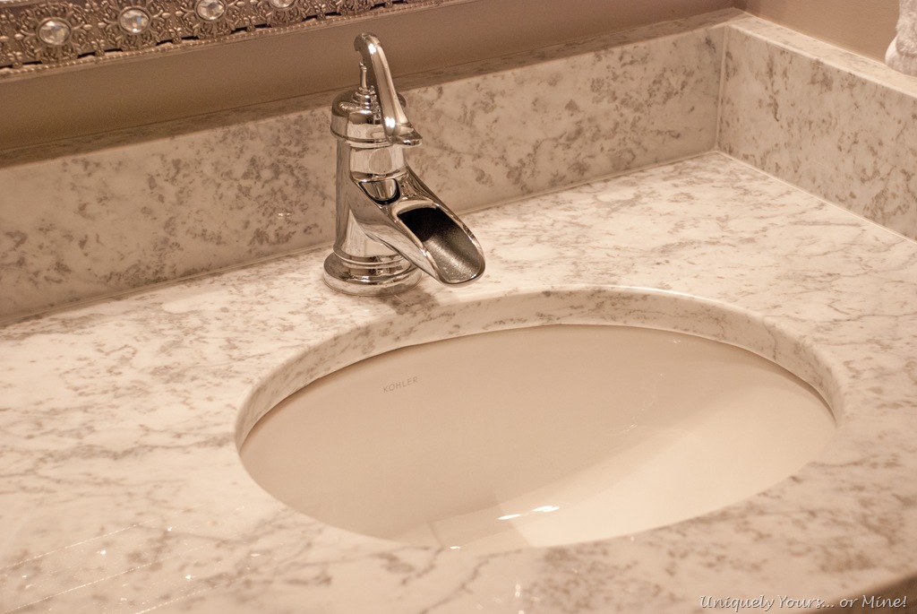 My SAH replaced the sink, faucet and top with a beautiful marble, pump style faucet and Kohler under mount sink. I replaced the light fixture and mirror, you know the “easy” things to replace…