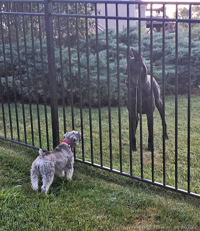 (This is just one of the Danes and our Schnoodle giving him the what for… can you see that DROOL?!)