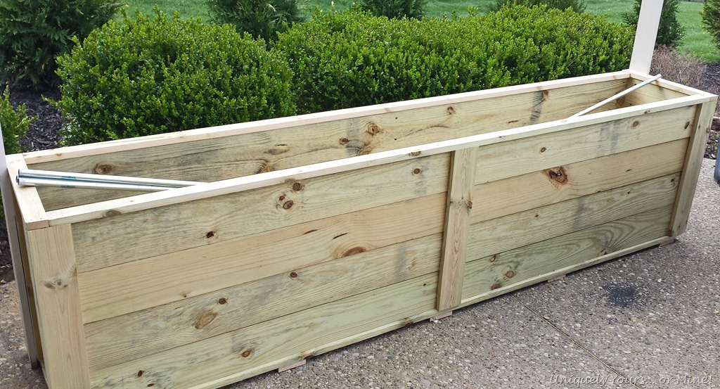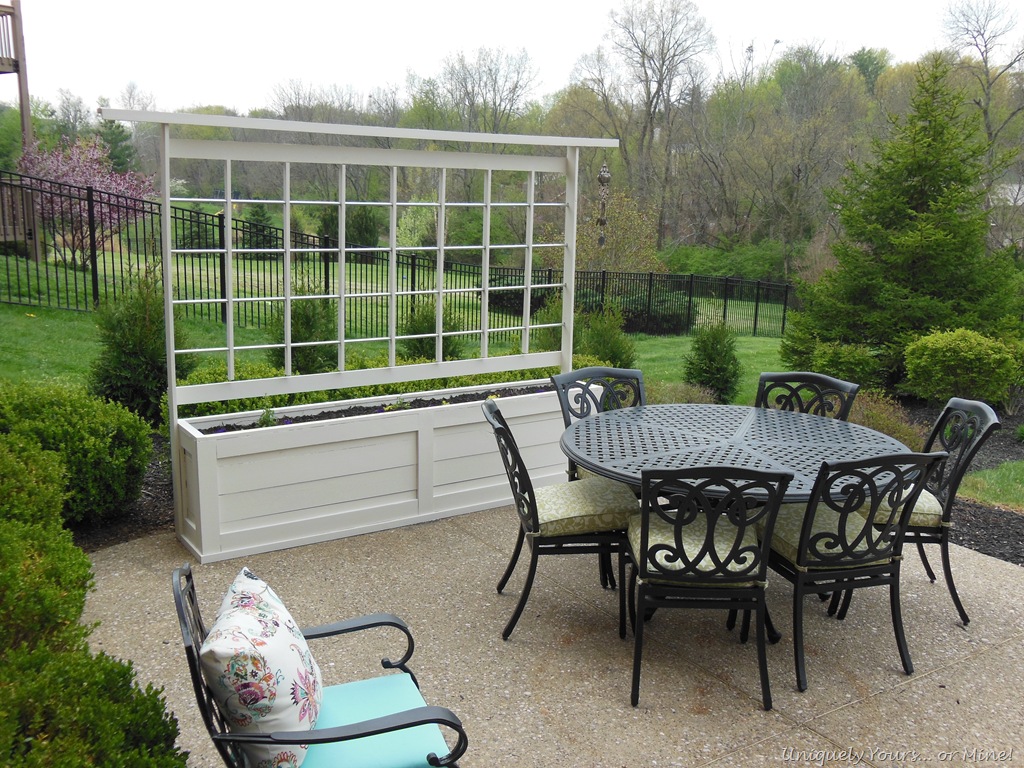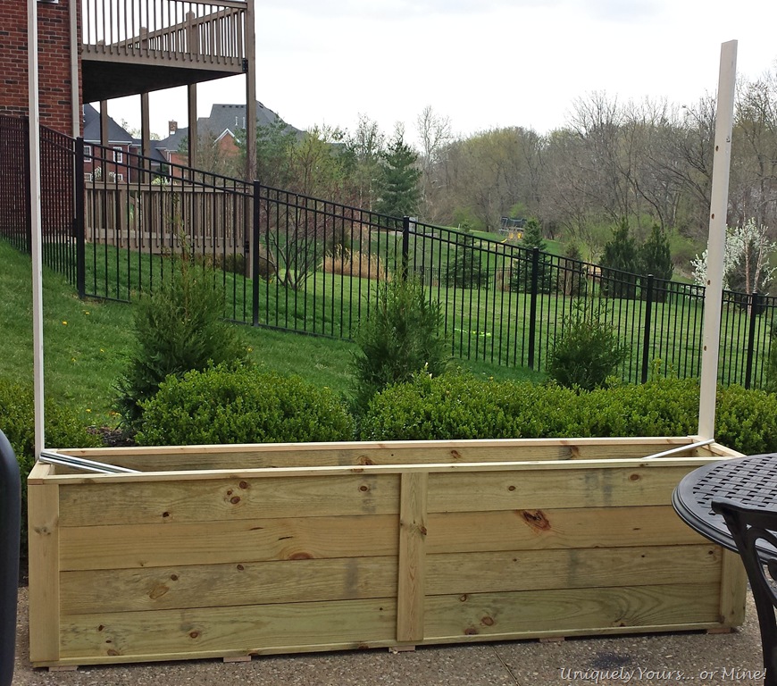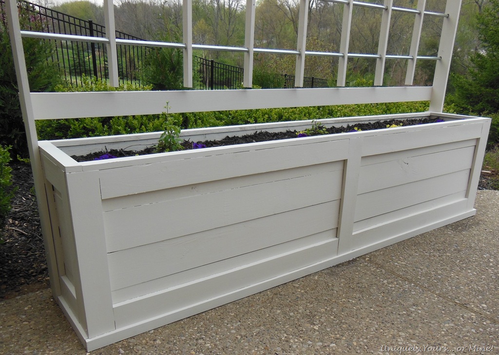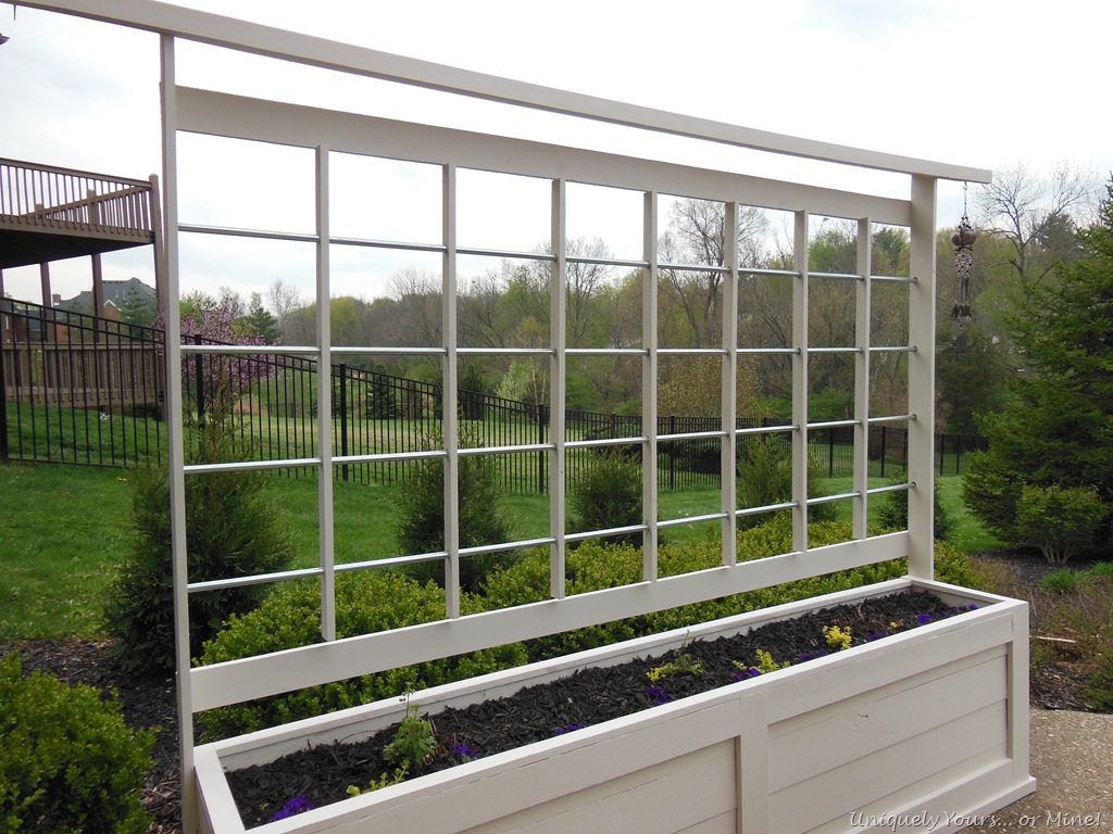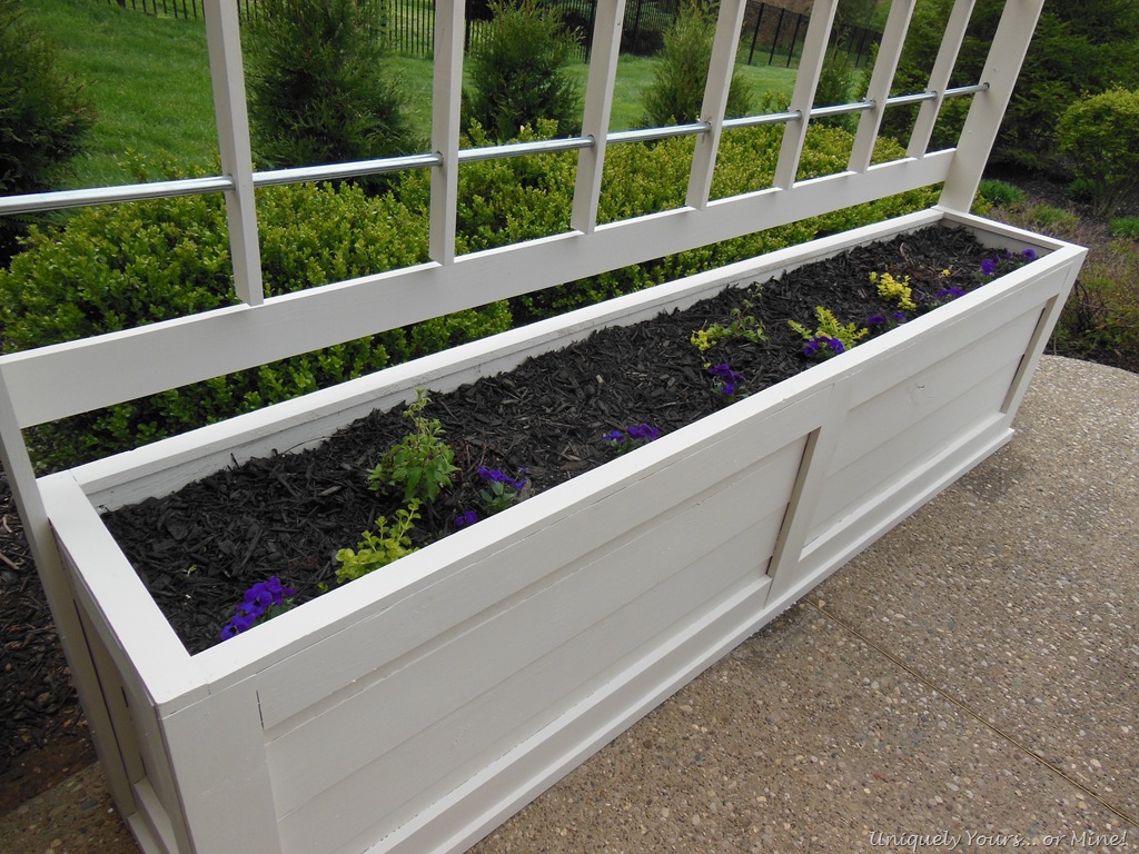 Hey guys! I hope all of you are doing well and didn’t suffer much damage from the frost that hit us (totally out of the blue) last week! I covered my newly planted Vinca, but they still aren’t looking so good right now. This past weekend, when we had fabulous temperatures in the 80’s, my Super Awesome Hubby and I built a planter box and trellis. We had two main reasons for building this, one being our old pots were crumbling and we needed a trellis for the vines planted in them and 2 to help with screening from our next door neighbors dogs. They have 3 Great Danes and a Blood Hound (who come out through the BIGGEST doggie door I have ever seen) just about every time we come outside… they bark quite a bit and like to stare so a little privacy from them was desired.