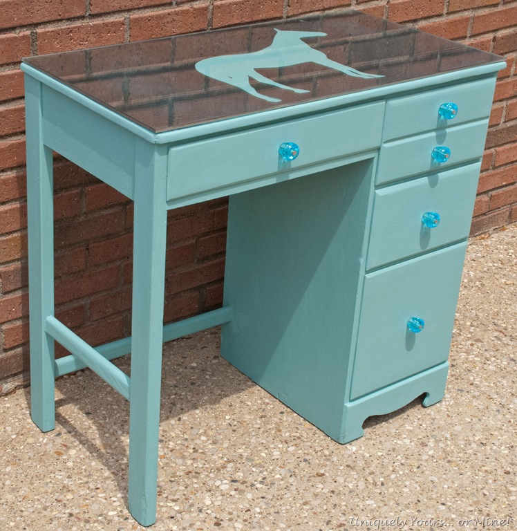 Funny story… We used the silhouette or of our miniature donkey for our website logo and painted him blue:-). No wonder we liked this desk!