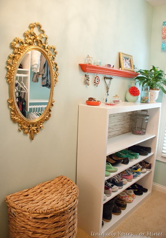 Love this! What a great eye for color you have! Love the chandelier and the coral shelf, I think I could live in this closet :). Great job.