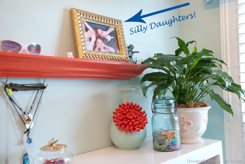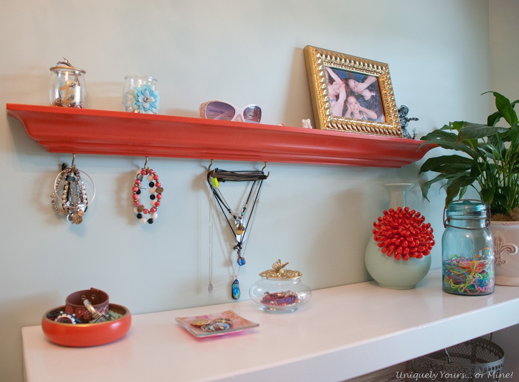 The picture rail was also in storage. I color matched the chrysanthemum on the vase to get the perfect coral color, it’s Benjamin Moore Claret Rose # 2008-20. I also added some cup hooks to the bottom to hang her necklaces and bracelets.
