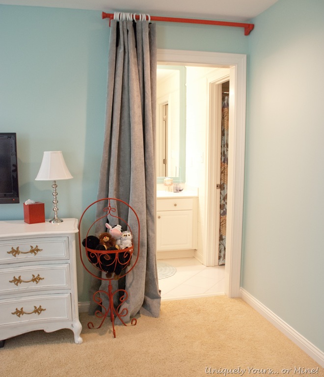 We added the curtain over the vanity doorway because this area freaks her out at night. So she closes these every night and it solves the problem. We had these curtains in her last room so all I did was paint the rod coral. I also painted her vintage plant stand coral to bring in some smaller punches of coral around the room.