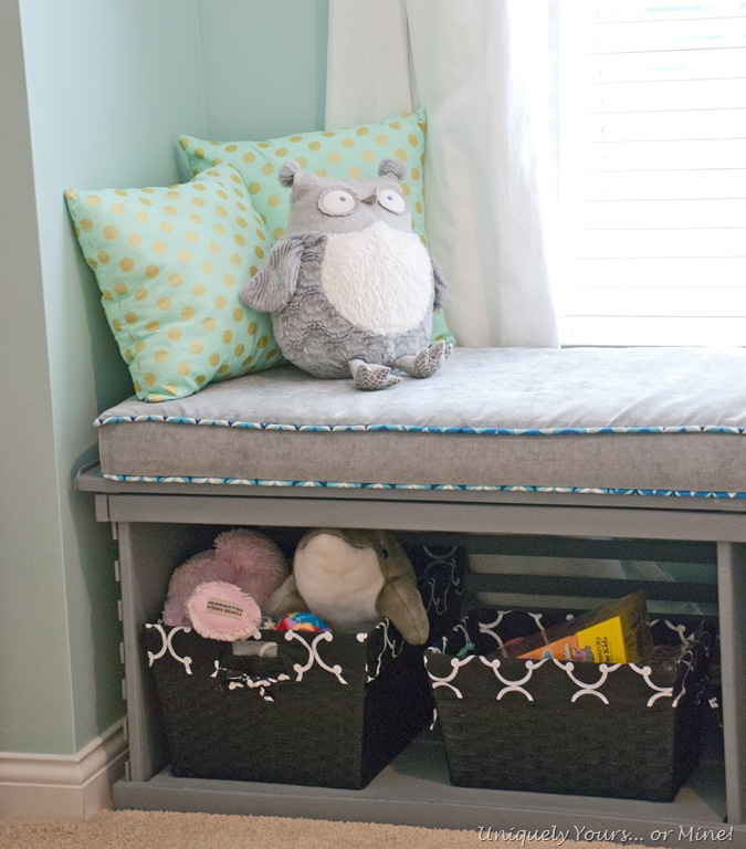I love this window seat we made for her last room and it has a perfect place in her new room. I made a couple of little throw pillows for her in case she ever decides to sit on it…
