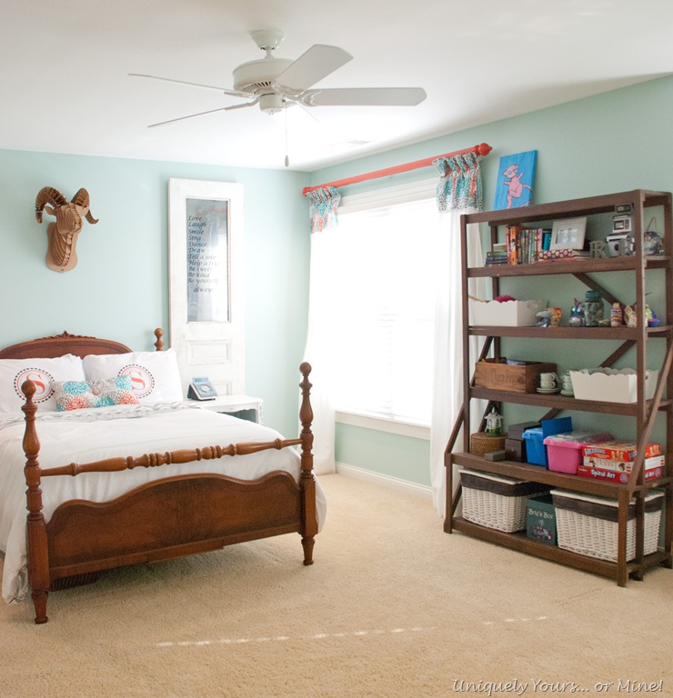 Teenage girl bedroom blue, coral & grayVintage shelving for toy storage