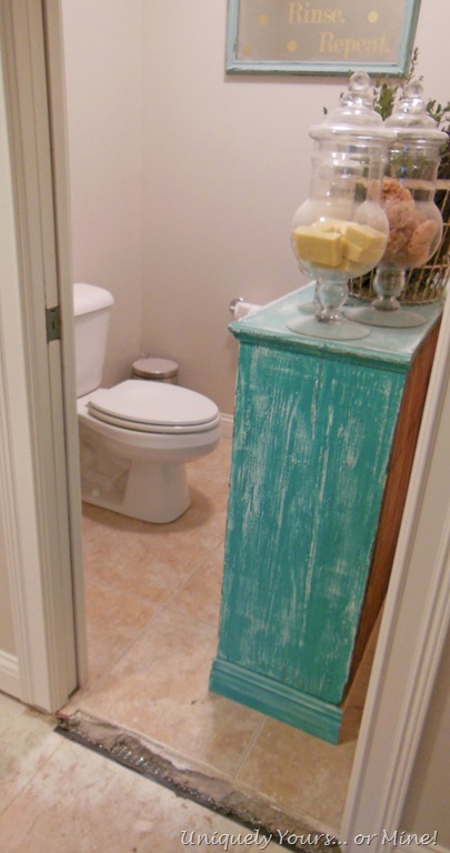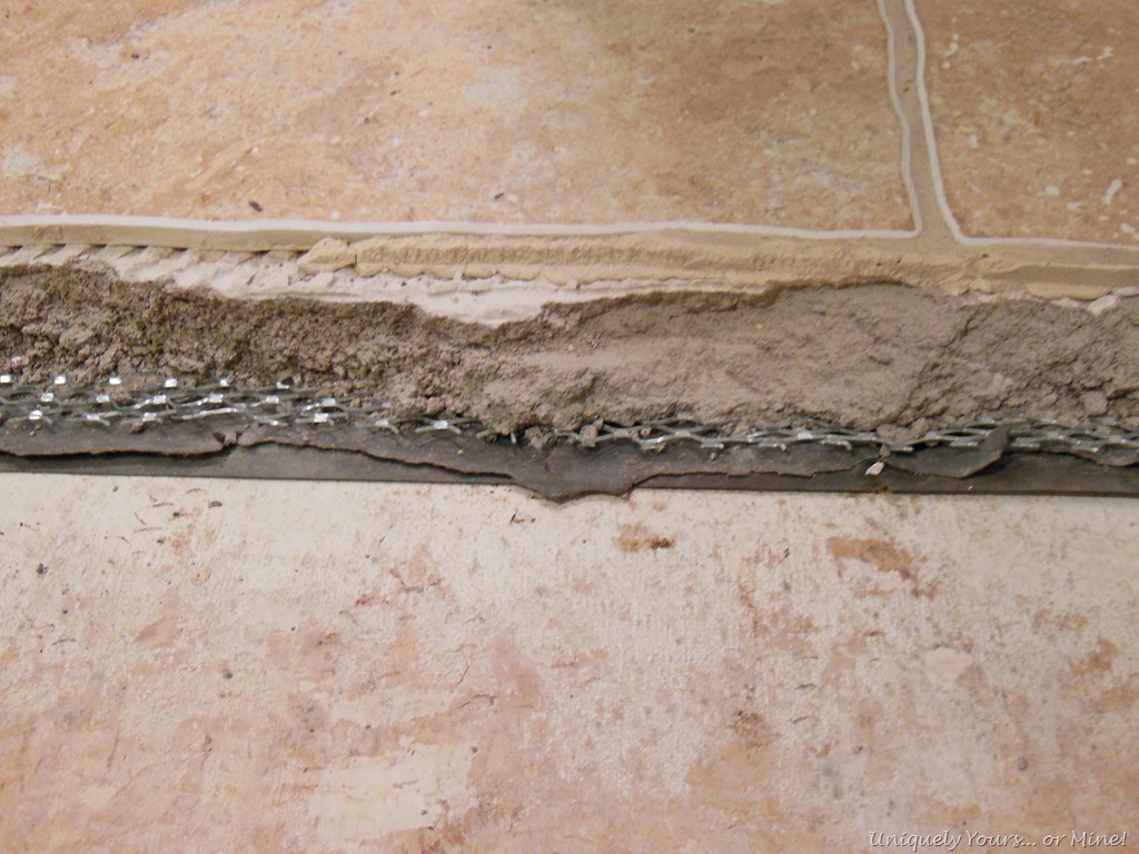 After removing my vanity we discovered that the floor tile was set in a bed of concrete and lath and it was roughly 1.5” thick… that’s a LOT of concrete and mainly why we didn’t want to tackle this ourselves.