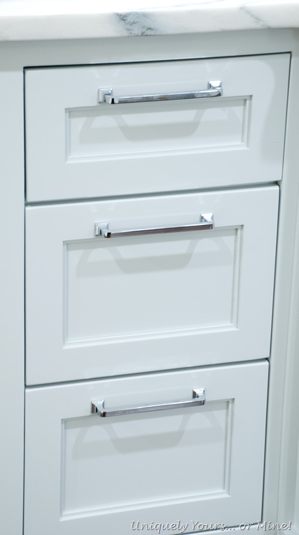 The drawer pulls are polished nickel and I painted the cabinets and tub apron in Benjamin Moore Wickham Gray which is a very light gray with blue undertones. I chose to spray paint the drawer and door fronts, but I brushed the cabinet frames. I used the BM Advance line in Satin and it was fabulous to work with and left virtually no visible brush strokes.