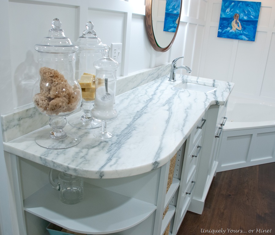 Two sections of this vanity I purchased off Craig’s List months ago, but my Hubby made the curved shelf piece at the left end to finish it off.
