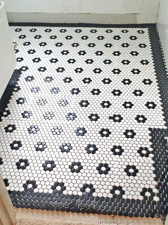 I purchased this pretty white hexagon tile with black flowers and a box of just black hexagon tiles to create the border around the room. All of our girls had b&w mosaic tiles in their last bathrooms and I just really love the classic look of them. I did a dry layout on the bathroom floor to ensure I had the look I wanted and enough tile for the job.