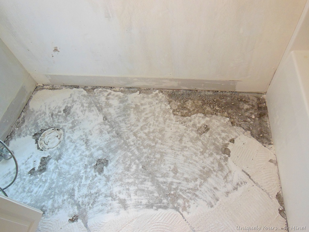 Now as to the floor, seriously I could have left the 8×8” white tiles, but I HATED them and their stupid stained white grout. So I removed them with my hammer drill (super easy just use ear plugs and eye protection for sure) and was left with the underlying mortar to remove.