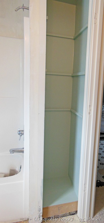 There is also a little linen nook in the bathroom, where we are adding nicer shelving, which I painted the same color as the ceiling.