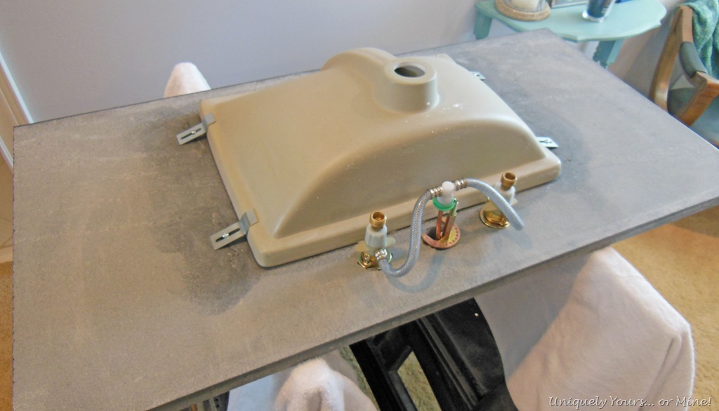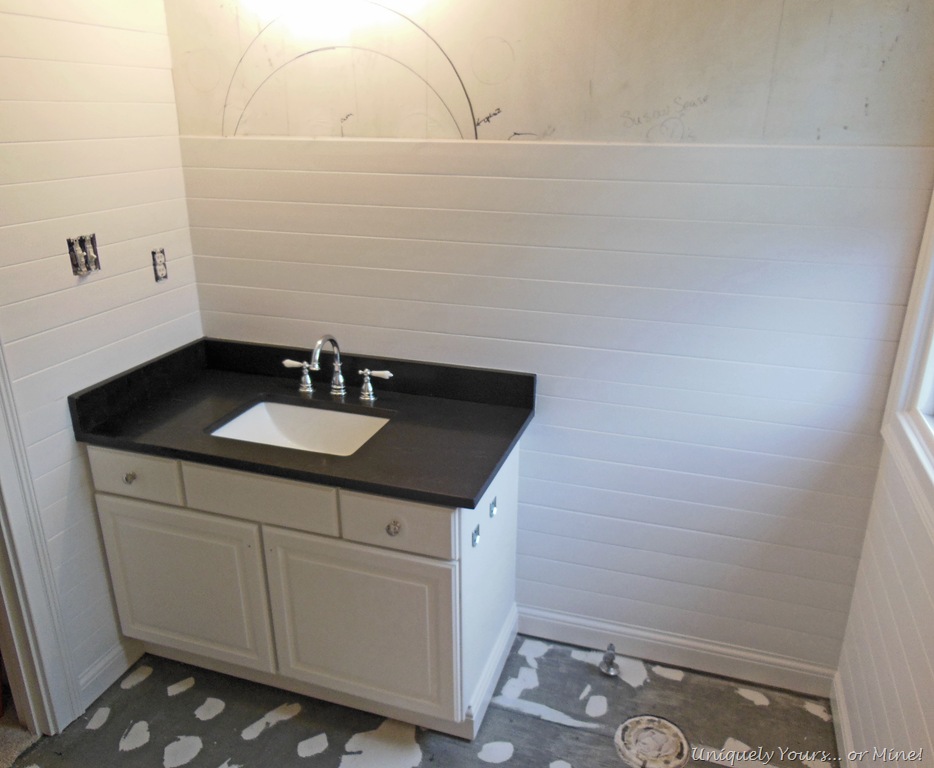 We installed the granite and backsplashes which was as easy as applying a bead of silicone caulk in the top edge of the vanity cabinet then placing the granite on top and ensuring levelness. The backsplashes are adhered to the wall with caulk as well.
