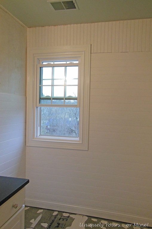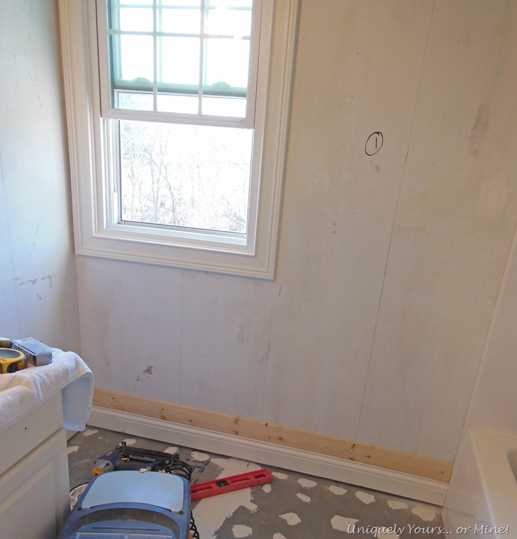 We reinstalled the baseboards and started our planking leveling each board as we went. We are using the same process and V-groove planking and bead board we used on the other girls bathroom.