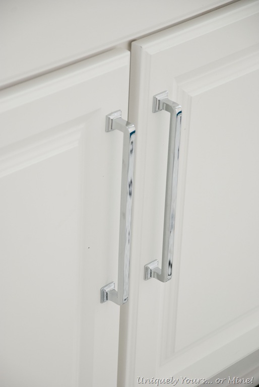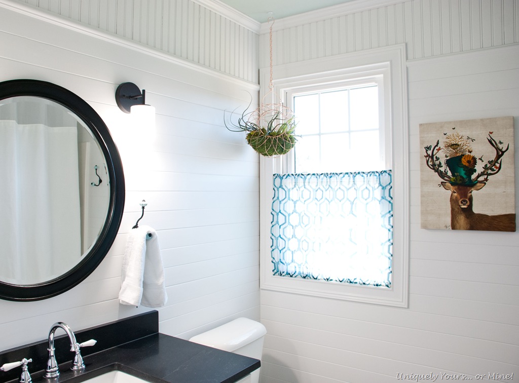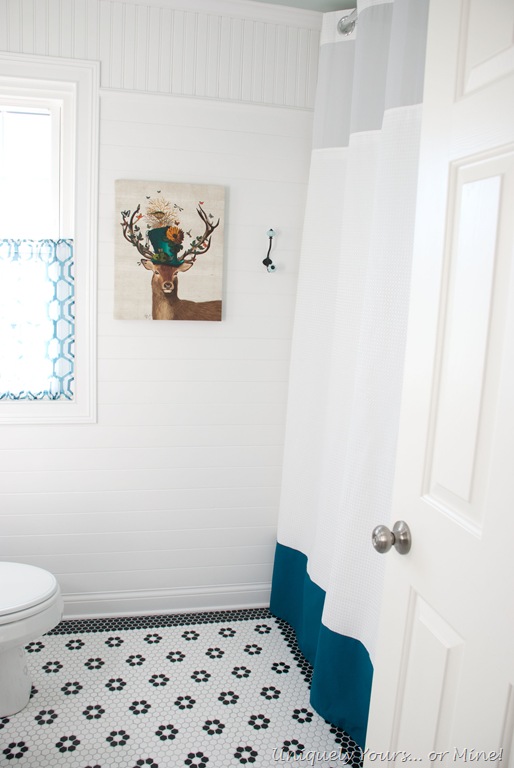 BTW I love this shower curtain! It’s from Bed, Bath & Beyond and has a mesh top which allows the light to filter into the shower area and it also has a built in curtain liner (just below the mesh) that snaps off!! I customized the curtain by sewing the teal band at the bottom, but the quality of the curtain is great! I also installed the rod just under the crown molding which makes the height of the room feel like 10’ instead of 8’… don’t know how but it does!