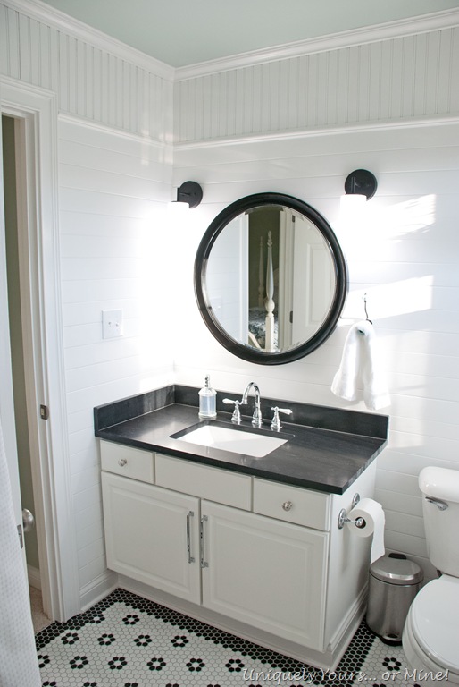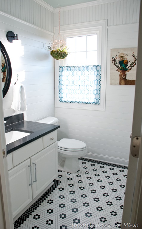 In go the wall planks, granite vanity top, 1” hexagon black and white floor tile!