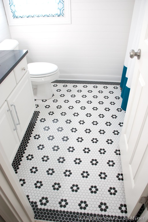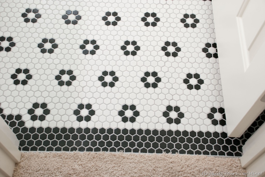 DIY black and white 1" hexagon mosaic floor with flowers