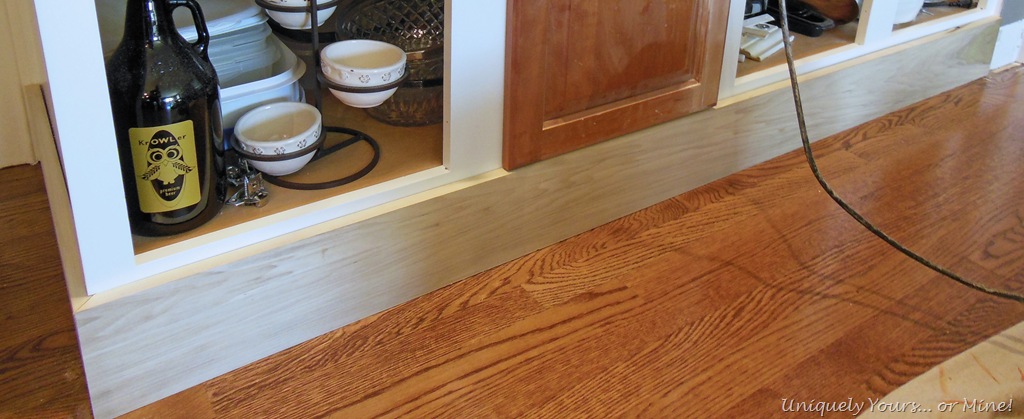 I removed the shoe molding from the kick plate and we dry fit a 4” piece of poplar wood which is very smooth and solid. We chose to use solid wood instead of MDF because we were routering the top and MDF doesn’t look as crisp/sharp as real wood does when routered in my opinion.