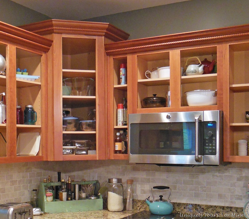 I found this idea while browsing kitchen cabinet photos and thought it was genius! Now I don’t want my cabinet to come all the way down to the countertop, but the general idea seems perfect for me!