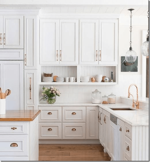 SO… I did confer with my Hubby about the scope creep in the kitchen as originally I was just painting cabinets and replacing cabinet hardware, but I had a thought one day while sitting at the island enjoying my lunch. You see I like the idea of open shelving in the kitchen, just not the function of keeping it all nice, neat, clean and overall perfect looking. What I do like about it is the ease of getting the item you need or putting something back in its place quickly, so nice right?! So my plan is to raise the cabinets to the ceiling and add an open cabinet/box under the cabinets in order to have the best of both worlds. Similar to this but without the bead board back.