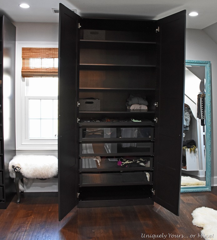 My closed wardrobe area that I have setup for my “delicates” and jewelry. Clearly I have a ton of unused space, but I don’t really have anything else to store. I love it though! The doors I painted to match the IKEA brown/black color of the cabinet.