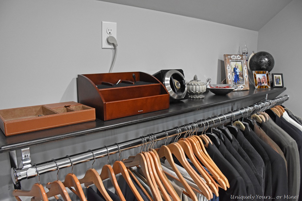 Now for my hubbies side of the closet. Again using the heavy duty metal rods and custom cut and stained wood tops.